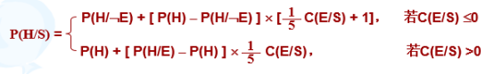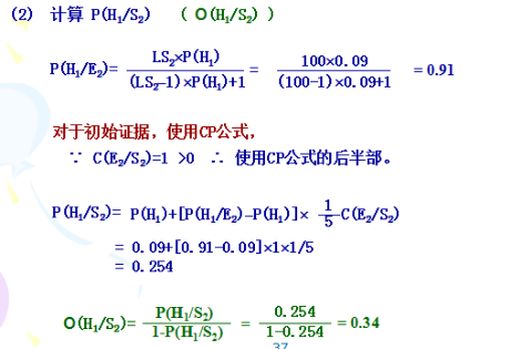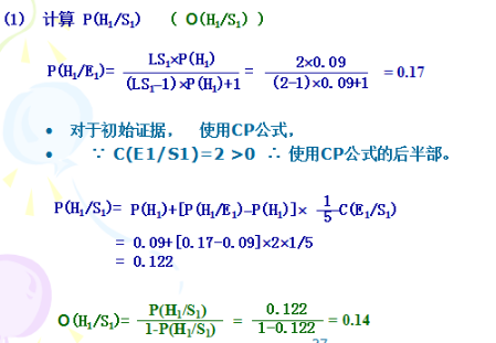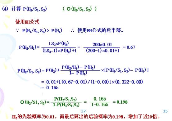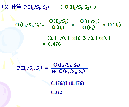 由于P(H1| S1,S2)=0.35040 > P(H1),使用P(H | S)公式的后半部分,得到在当前观察S1,S2下H2的后验概率P(H2| S1,S2)和后验几率O(H2| S1,S2)