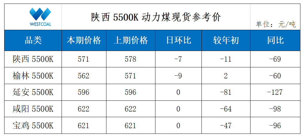 陕西方面,当前大部分煤矿维持正常生产,个别矿井进行停产检修,煤炭供应相对稳定。但需求侧的支撑力却有所减弱。下游的采购积极性不高,尤其是电厂主要以刚需补库为主,影响了市场情绪,部分煤矿为促进销售而调降价格。整体来看,今日产地煤价以降为主,幅度主要集中在5-20元/吨。