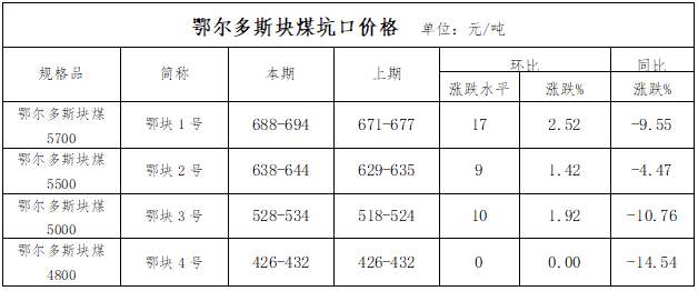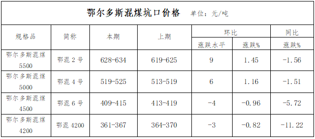 综上所述,短期市场将维持高位震荡,本期鄂尔多斯混煤价格指数上涨,具体来看,混煤坑口价格、混煤车板价格、块煤坑口价格、原煤坑口价格以及到港指导低卡价格或稳或降,高卡价格全面上涨。