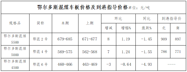 二、鄂尔多斯混煤车板价格及到港指导价格