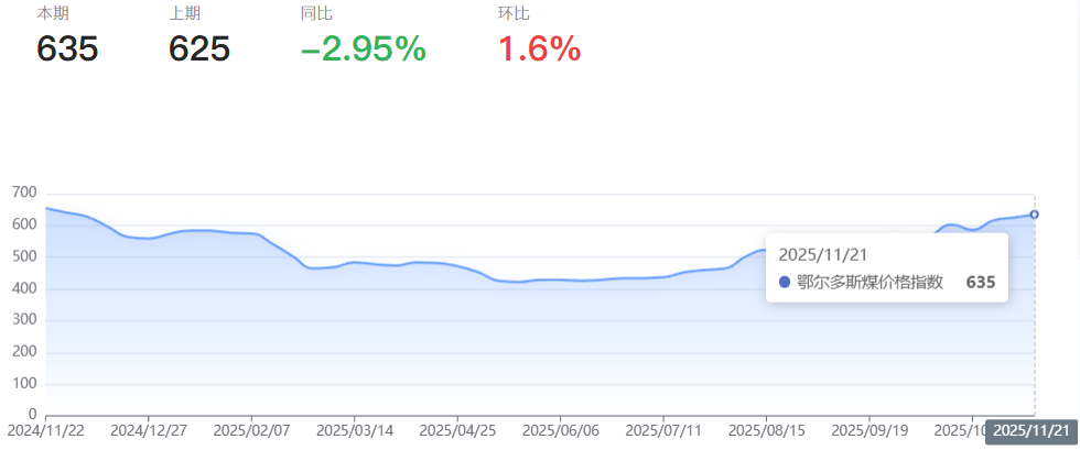 本报告周期(2025年11月15日--2025年11月21日,下同),鄂尔多斯煤价格指数报收635点,环比上涨10点,涨幅1.6%,同比下降2.95%。