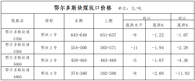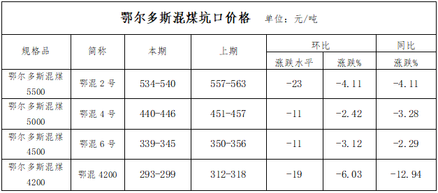 综上所述,市场由速跌转为僵持,本期鄂尔多斯混煤价格指数下降,具体来看,混煤坑口价格、混煤车板价格、块煤坑口价格、原煤坑口价格以及到港指导价格全面下降,但降幅收窄。