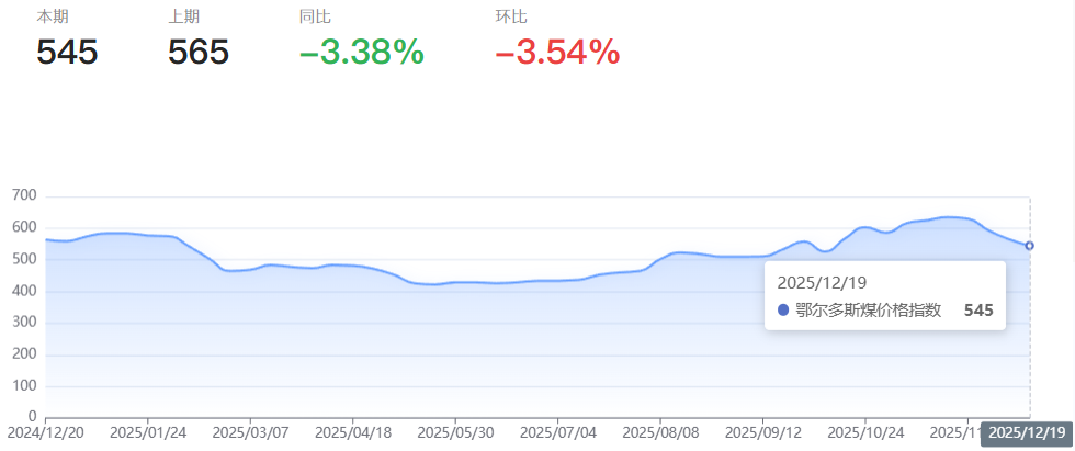 本报告周期(2025年12月13日--2025年12月19日,下同),鄂尔多斯煤价格指数报收545点,环比下降20点,降幅3.54%,同比下降3.38%。