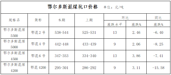 本报告期,鄂尔多斯地区混煤价格指数上涨,各个环节运行结果如下: