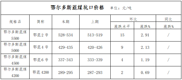 本报告期,鄂尔多斯地区混煤价格指数上涨,各个环节运行结果如下: