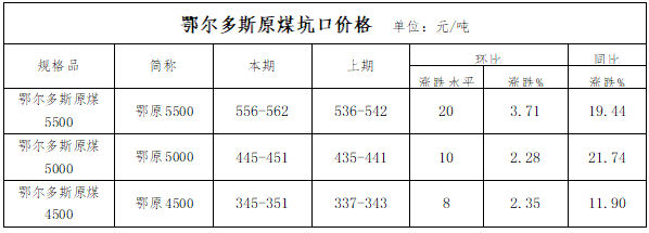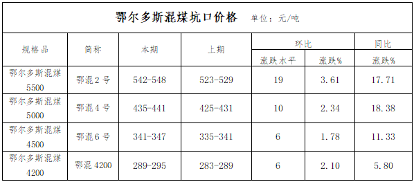 本报告期,鄂尔多斯地区混煤价格指数上涨,各个环节运行结果如下: