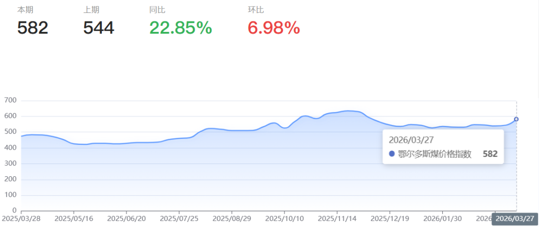 本报告周期(2026年3月21日--2026年3月27日,下同),鄂尔多斯煤价格指数报收582点,环比上涨38点,涨幅6.98%,同比上涨22.85%。