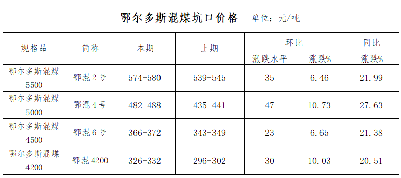 本报告期,鄂尔多斯地区混煤价格指数上涨,各个环节运行结果如下: