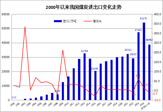 海关总署11月7日公布的统计数据显示,2025年1-10月,全国煤炭进口总量累计为38762.3万吨,较上年同期43530.0万吨减少4768万吨,同比下降11.0%。