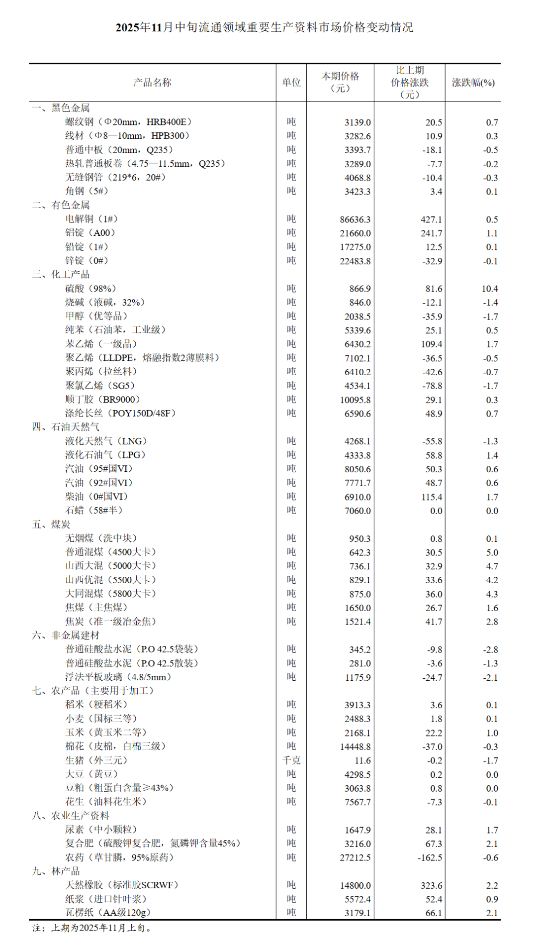 据对全国流通领域9大类50种重要生产资料市场价格的监测显示,2025年11月中旬与11月上旬相比,30种产品价格上涨,17种下降,3种持平。