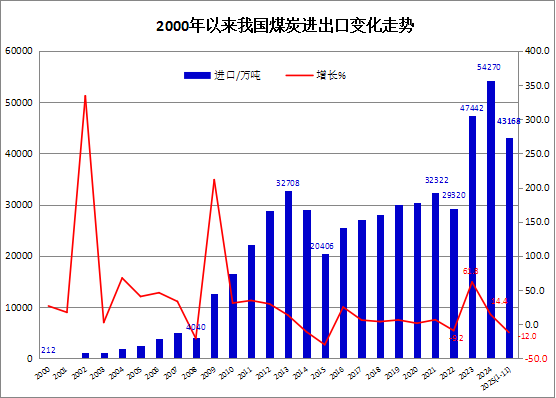 海关总署12月8日公布的统计数据显示,2025年1-11月,全国煤炭进口总量累计为43167.6万吨,较上年同期49027.8万吨减少5860万吨,同比下降12.0%。