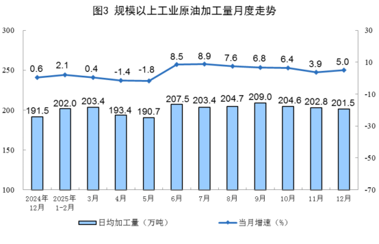 原油加工增速加快。12月份,规上工业原油加工量6246万吨,同比增长5.0%,增速比11月份加快1.1个百分点;日均加工量201.5万吨。1—12月份,规上工业原油加工量73759万吨,同比增长4.1%。