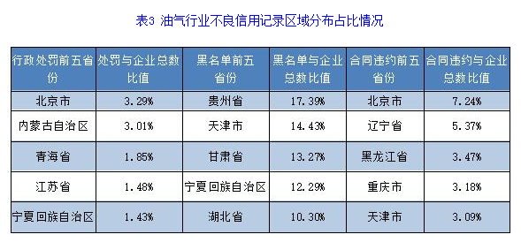 从油气行业不良信用记录区域分布占比情况看,北京市、天津市和宁夏回族自治区三项排名中,均同时有两项排名居于前五(见表3)。