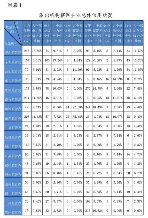 国家能源局18家派出机构所辖区域企业总体信用状况良好,集中在良级范围内(派出机构辖区企业总体信用状况见附表1)。