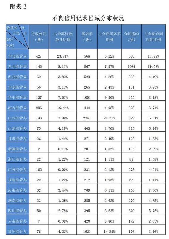 黑名单记录占全部黑名单记录比值较高的前五名为山西监管办、贵州监管办、华中监管局、东北监管局、河南监管办等辖区。
