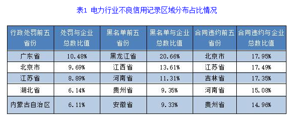 企业数量较多的地区,不良信用记录也较多。广东省、北京市、江苏省、湖北省、内蒙古自治区受到行政处罚的企业数量占该区域电力企业总数的比值较高。黑龙江省、江西省、河南省、贵州省、安徽省,黑名单数量占该区域电力企业总数的比值较高。北京市、江苏省、吉林省、河南省、贵州省发生合同违约数量占该区域电力企业总数的比值较高(见表1)。全国电力企业平均产生0.19条不良信用记录(不良信用记录总数/电力企业总数),高于全国平均水平的前五名分别是黑龙江省(0.35条)、北京市(0.34条)、江苏省(0.33条)、河南省(0.28条)、江西省(0.28条);低于全国平均水平的前五名分别是西藏自治区(0.03条)、海南省(0.06条)、云南省(0.08条)、新疆维吾尔自治区(0.1条)、陕西省(0.11条)。从电力行业不良信用记录区域分布占比情况看,北京市、江苏省、河南省和贵州省三项排名中,均同时有两项排名居于前五(见表1)。