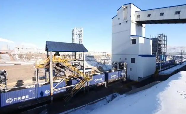 新疆准东露天煤矿环线装车点,一列煤运列车正有序进行煤炭装车