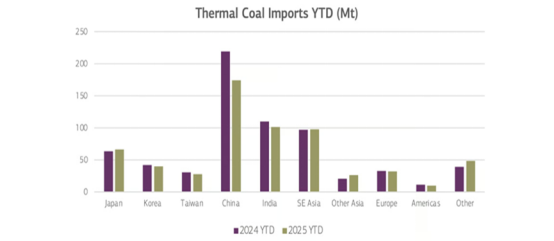 由于液化天然气和其他燃料的价格竞争力持续存在,前8个月全球海运动力煤贸易量累计成交量同比下降6%,反映了主要市场国内供应增加以及可再生能源和核能发电扩张的影响,继续取代了部分进口。