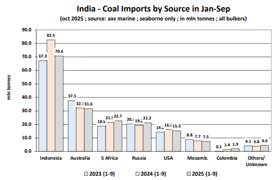 由于商业和政治因素,印度进口贸易格局也相应发生变化。印度尼西亚继续是印度最大的煤炭进口来源国, 2025年前9个月,印度从印度尼西亚进口的煤炭同比下降14.4%,降至7060万吨,但仍高于2023年1月至9月的6730万吨,占印度同期煤炭总进口量的40.3%。