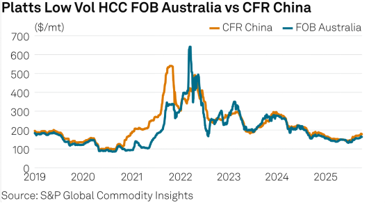 与此同时,普氏能源资讯(Platts)数据显示,2025年前9个月,澳大利亚半硬焦煤(PHCCs)价格获得了南亚地区的价格支持,80笔交易中有68笔的收货目的地为印度。