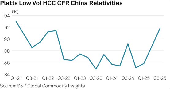 基于中国到岸价(CFR)的基准,普氏低挥发份硬焦煤(LV HCC)指数的相对值在第三季度升至91.7%,为近四年来最高水平,较第二季度的88.7%有所上升。