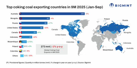 据BigMint 11月12日发布的信息,其整理的数据显示,2025年1-9月,全球焦煤出口量合计约为2.73亿吨,较去年同期的2.77亿吨下降1.4%。