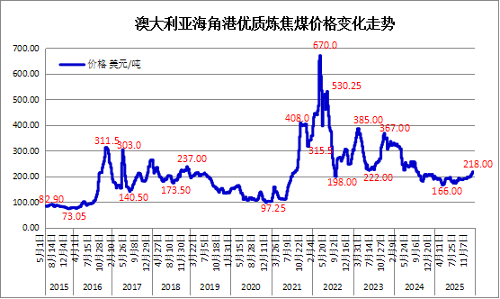 2025年12月中旬,澳大利亚炼焦煤离岸价格(FOB)为215.73美元/吨,较2024年12月价格上涨5.6%,较前一月价格上涨7.3%。2025年年底市场价格处于复苏状态,当前价格水平为2024年7月以来的最高水平。