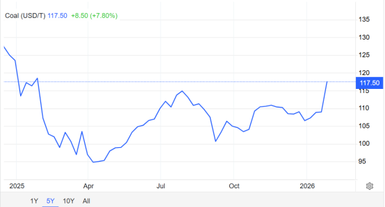 据外媒2月2日报道的消息,路孚特(Refinitiv)数据显示,上周五(2026年1月30日)交易日,全球动力煤基准洲际交易所(ICE)纽卡斯尔煤炭期货合约交易价格继续大涨,当日收盘价上涨至117.50美元/吨,环比前一交易日每吨上涨5.75美元,涨幅达5.14%,直逼预期的120美元/吨关口。