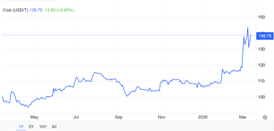 路孚特(Refinitiv)数据显示,周四(3月12日)交易日,全球动力煤基准洲际交易所(ICE)纽卡斯尔煤炭期货次月交割合约交易价格再度连续上涨,收于每吨138.75美元,再度逼近140美元,环比前一个交易日上涨3.85美元,涨幅为2.85%。最近两个交易日内累计上涨了5.8%。