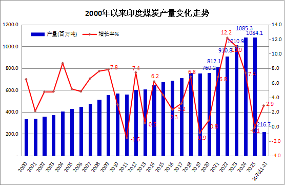 2026年1-2月印度煤炭产量同比增长2.9%