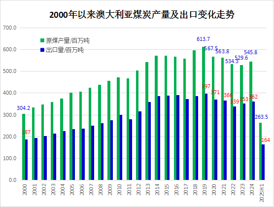 据澳大利亚联邦工业、科学和资源部(Department of Industry, Science and Resources)首席经济师办公室(Office of the Chief Economist -OCE)10月7日发布的2025年三季度《资源和能源季报—REQ》(Resources and Energy Quarterly,September 2025)数据显示,2025年上半年,澳大利亚原煤(Black coal, raw)总产量为2.63亿吨,比上年同期下降2.3%;可销售的商品煤(Black coal, saleable)产量为2.04亿吨,同比下降1.9%。
