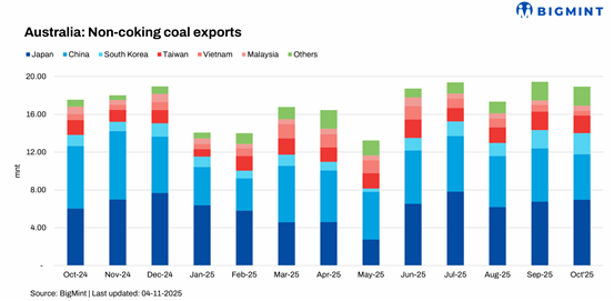 BigMint 当日发布的信息还显示,2025年10月,澳大利亚动力煤(Non-coking coal,非焦煤)出口量为1892万吨,环比9月的1944万吨下降2.6%;而与2024年10月的1756万吨相比,出口量仍增长了7.8%。