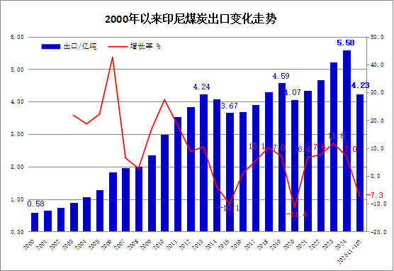 印尼统计局:2025年1-10月印尼煤炭出口4.23亿吨 同比下降7.3%