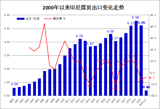 印尼统计局:2026年1月印尼煤炭出口同比减少4.1%,环比下降22.7%