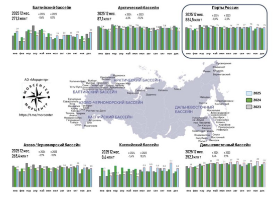 据俄罗斯海港行业协会(Association of Sea Trade Ports-ASOP)2026年1月16日发布的信息,2025年1-12月,俄罗斯海港货物吞吐量累计为8.845亿吨,较上年同期下降0.4%。