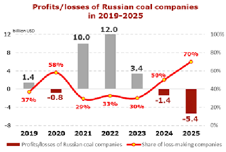 近几年,俄罗斯煤炭企业经济效益持续下行,2022年盈利达到峰值实现利润120亿美元,此后出现连续三年大幅下降。2024年由上年盈利的34亿美元转为亏损14亿美元,亏损面达50%;2025年亏损继续加大,亏损额达54亿美元,亏损企业的占比达到70%。共有62家企业处于亏损状态,其中20家已停产,其余企业也濒临停产边缘。