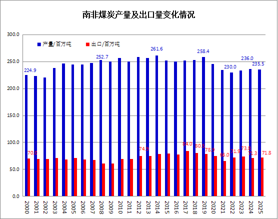 2025年南非煤炭产量2.355亿吨,同比微降0.2%