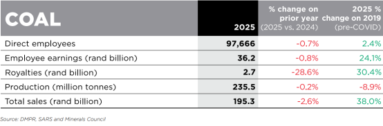 据南非矿业理事会(Minerals Council South Africa) 2月9日发布的年度矿业报告(FACTS AND FIGURES 2025)数据显示,2025年,南非煤炭总产量为2.355亿吨,与2024年的2.36亿吨的生产水平基本相当,微降0.2%。