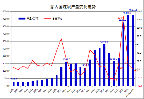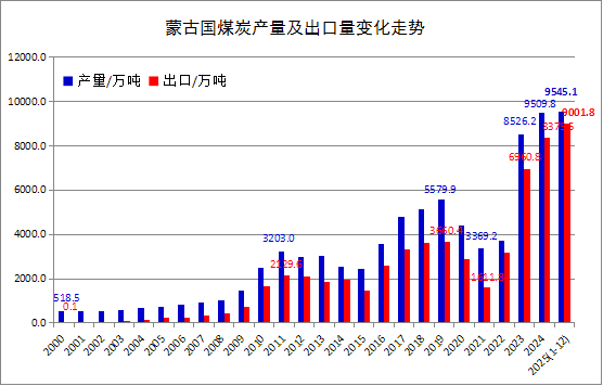 2025年1-12月蒙古国煤炭产量9545.1万吨,同比增长0.4%