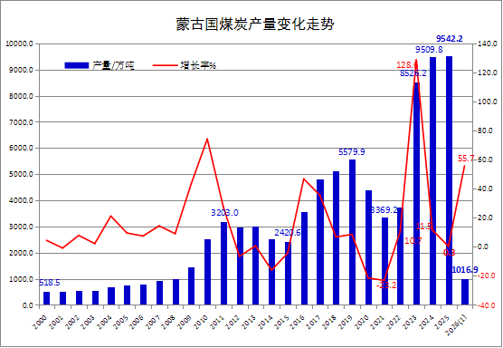 2026年1月份,蒙古国煤炭产量为1016.89万吨,同比增长55.7%,环比下降2.3%。