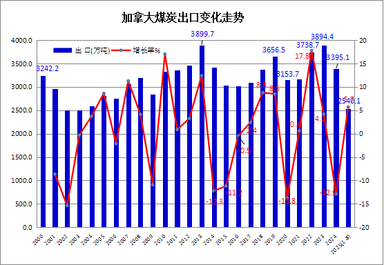 其中,8月份加拿大煤炭出口量为296.7万吨,同比增长1.8%,环比下降15.0%。