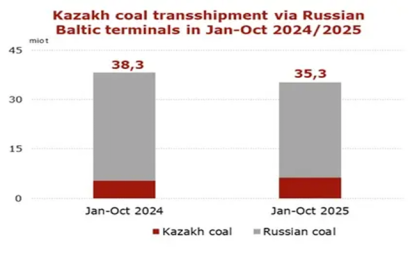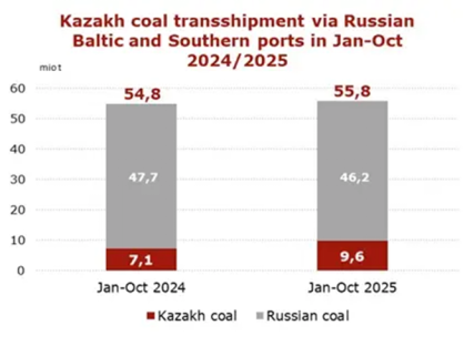 据俄罗斯分析机构CCA Analysis 11月17日发布的信息,2025年1-10月,哈萨克斯坦经俄罗斯港口转运欧洲国家的煤炭出口量增至960万吨,同比增加250万吨,增长34%。