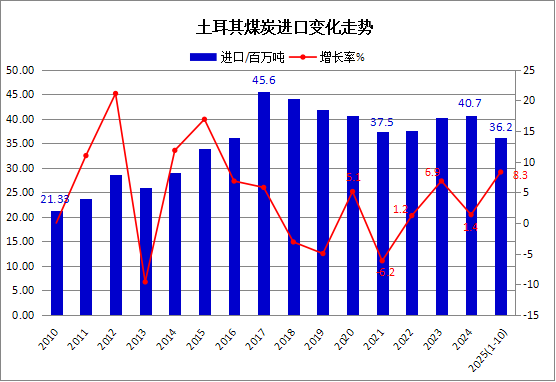 其中,10月份土耳其煤炭进口量为408.6万吨,同比增加15.4%,环比增长10.0%。