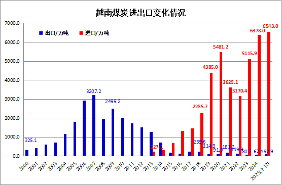 据越南财政部海关总局(GENERAL DEPARTMENT OF CUSTOMS,MINISTRY OF FINANCE OF VIETNAM)2026年1月6日发布的商品进出口数据显示,2025年1-12月,越南煤炭进口6543.0万吨,比上年同期增长2.6%;煤炭出口92.86万吨,同比增长37.8%。