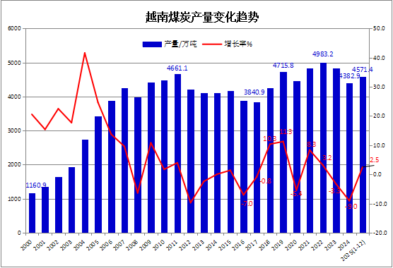 据越南国家统计局(NATIONAL STATISTICS OFFICE-NSO)发布的主要工业产品产量统计快报数据显示,2025年1-12月,越南煤炭产量预计为4571.4万吨,比上年同期增长2.5%。