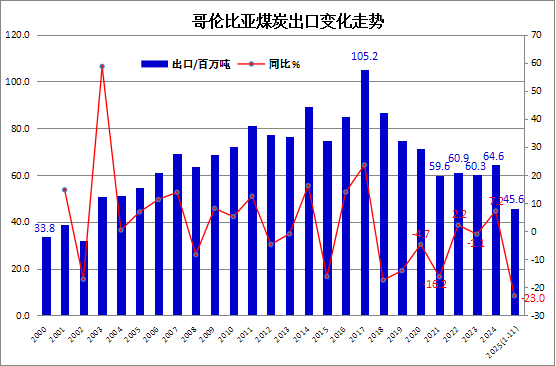据哥伦比亚国家统计机构(Departamento Administrativo Nacional de Estadística—DANE)发布的最新统计数据显示,2025年1-11月,哥伦比亚煤炭出口量累计为4564.87万吨,较上年同期下降23.0%。