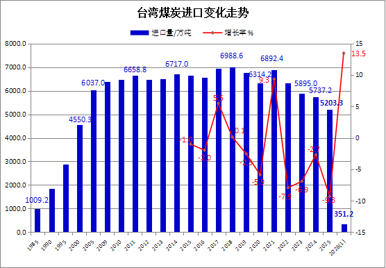 2026年1月份,我国台湾地区煤炭进口量为351.21万吨,较上年同期的309.56万吨增长13.5%,较前一个月的377.91万吨下降7.1%。