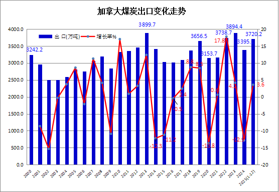 据加拿大统计局(Statistics Canada)发布的商品进出口统计数据,2025年1-12月,加拿大煤炭出口量累计为3720.2万吨,比上年同期增长3.6%。其中,12月份煤炭出口量为316.2万吨,同比下降14.5%,环比增长11.5%。
