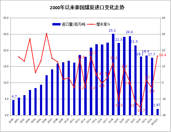 2026年1月份,泰国煤炭进口大幅增加,且进口的煤炭全为烟煤及无烟煤,当月进口量为196.73万吨,同比增长16.4%,环比增加105.3%。