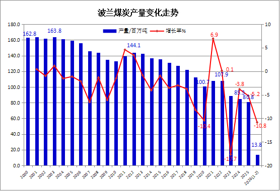 2026年1-2月波兰煤炭产量同比下降10.8%